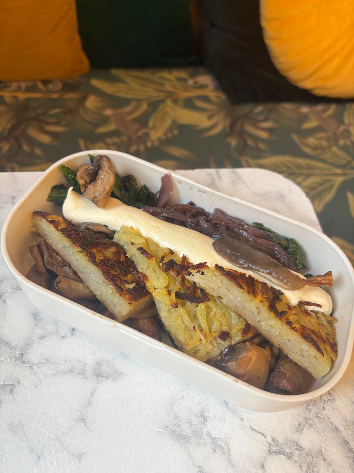 Galettes de PDT / oignons confits / crème de comté / champignons / épinards