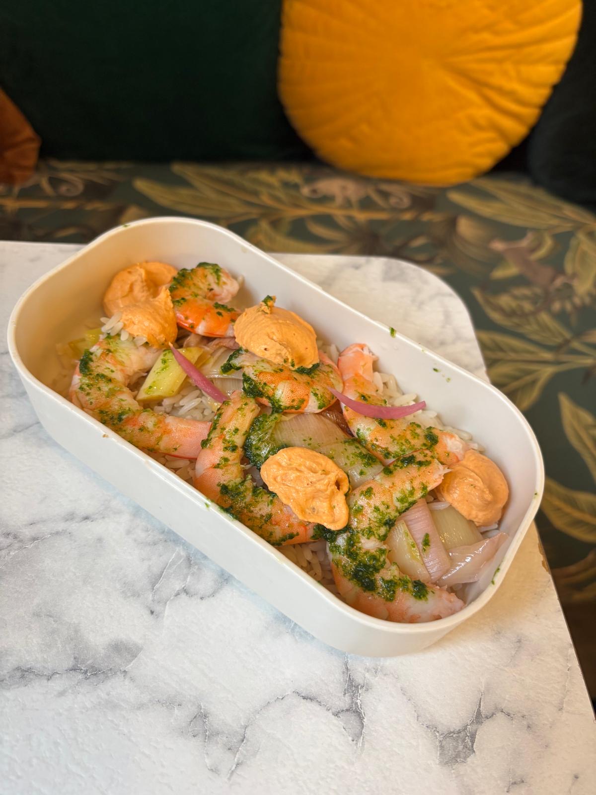 Crevettes / chorizo / persillade / poireaux / riz citron