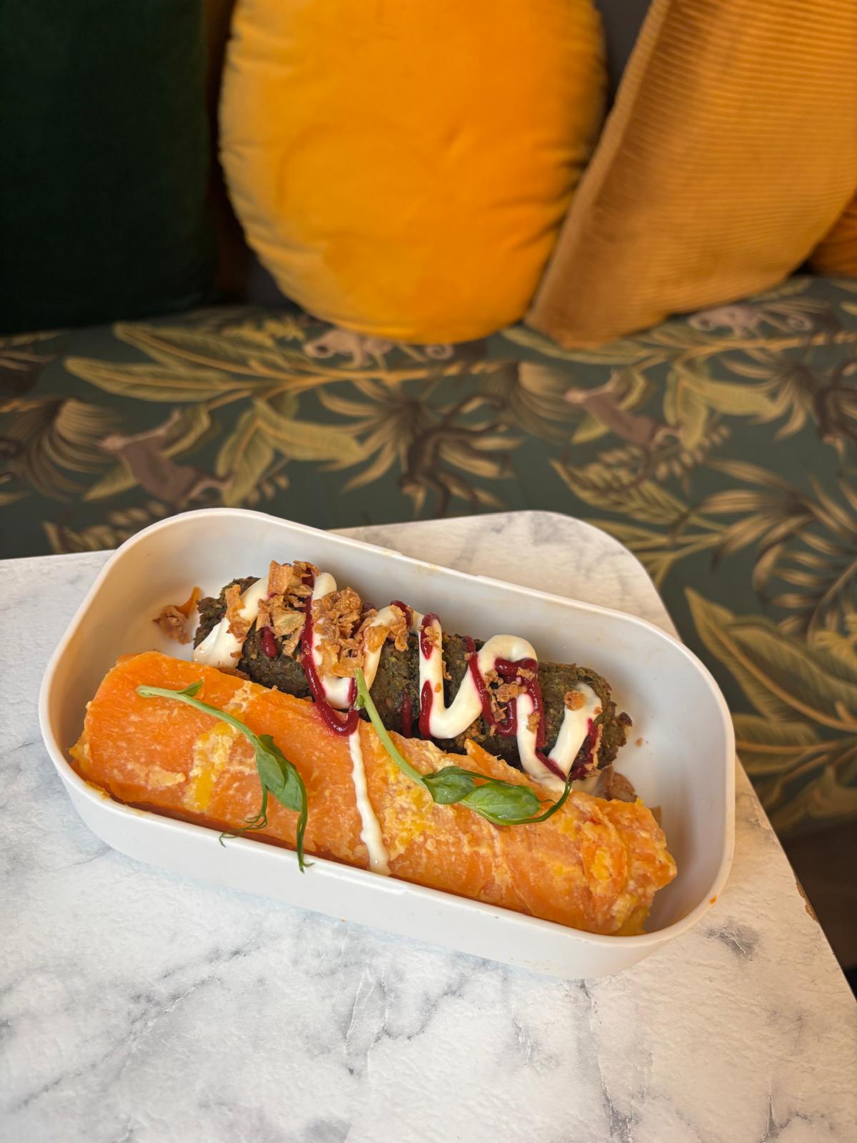 Saucisse végétarienne maison / gratin de patate douces / ketchup de betteraves / crème de morbier / oignons frits